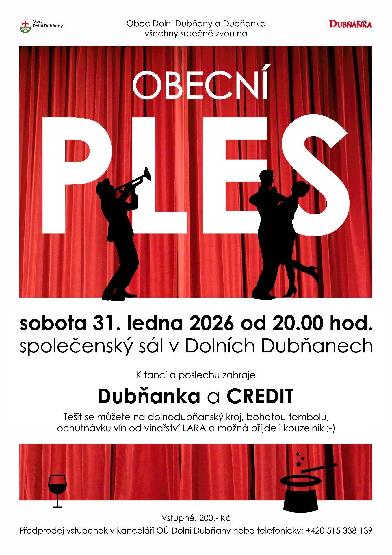 Obec Dolní Dubňany a Dubňanka Vás srdečně zvou na Obecní ples, který proběhne v sobotu 31. ledna 2026 ve společenském sále v Dolních Dubňanech! Zahraje Dubňanka spolu s kapelou Credit, těšit se může na dolnodubňanský kroj, bohatou tombolu, vína od Vinařství LARA a možná přijde i kouzelník!