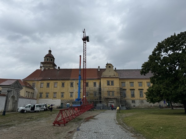 Stavbaři se pustili do plánované opravy části střechy zámku v Moravském Krumlově. Odborný zásah už potřebovala ta část nad vstupem do arkádového nádvoří, v místě, kde se nachází zvonička. Toto místo je nejstarší, nejvíce poškozené a jeho oprava byla nutná. Zároveň to je poměrně složitý krov, který vyžaduje odborný zásah, který je pracný a náročný.