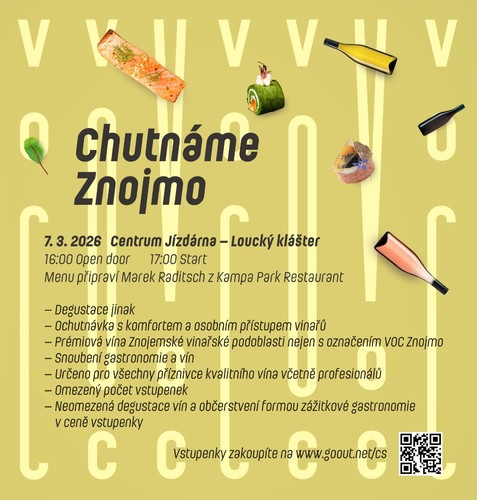 Již třetí ročník akce s názvem Chutnáme Znojmo se uskuteční 7. března 2026 v Centrum Jízdárna Louckého kláštera. Čeká vás zážitková gastronomie, nejlepší vína ze Znojemska a jedinečné místo, kde se snoubí historie s moderními trendy.