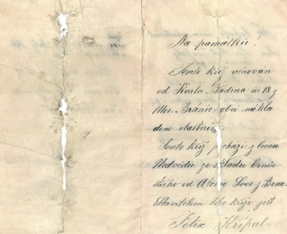 Tento kříž věnován od Karla Badina čís. 18 z Mor. Bránic obci nákladem vlastním.