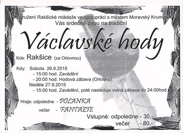 V Rakšicích se budou ve dnech 26.9 - 27.9.2015 konat Václavské hody. Odpolední program s kapelou Polanka začne v 15:00 a večerní hodová zábava s kapelou Fantazie ve 20:00. Vstupné odpoledne 30 Kč, večer 80 Kč.